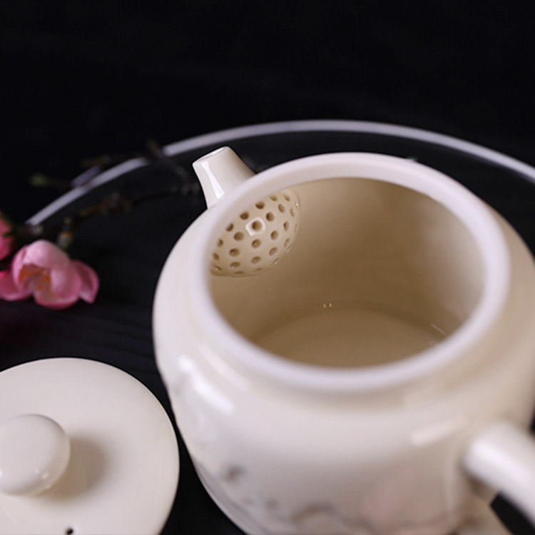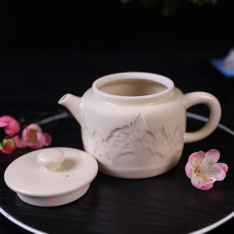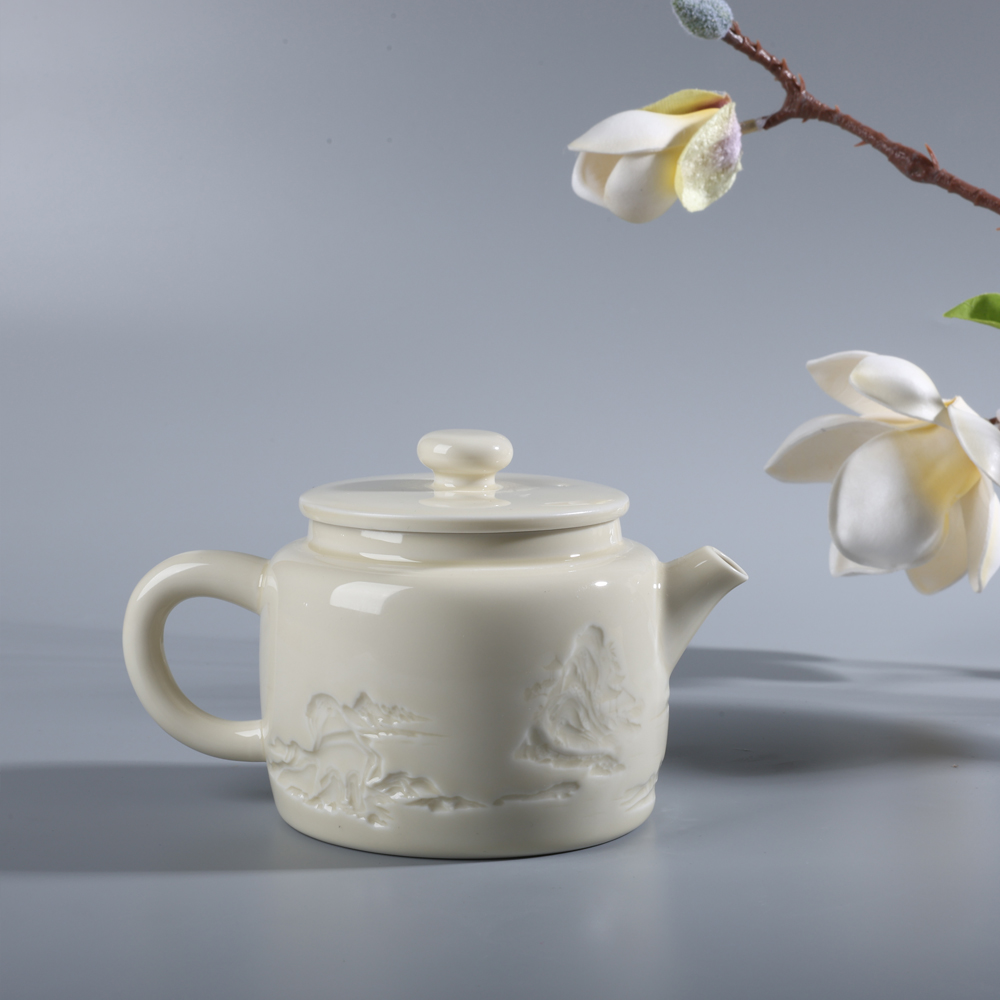 山居慢品,茶語(yǔ)人間。大宋定窯的一款山居茶壺,以精工雕刻之山居景色,呈現(xiàn)栩栩如生的浮雕效果。采用高溫?zé)?,釉面光滑?xì)膩,手感舒適。釉水采用古法配方,色白且微泛黃,采用浮雕+定瓷傳統(tǒng)燒制技藝,彰顯原礦胎釉的古風(fēng)之美。